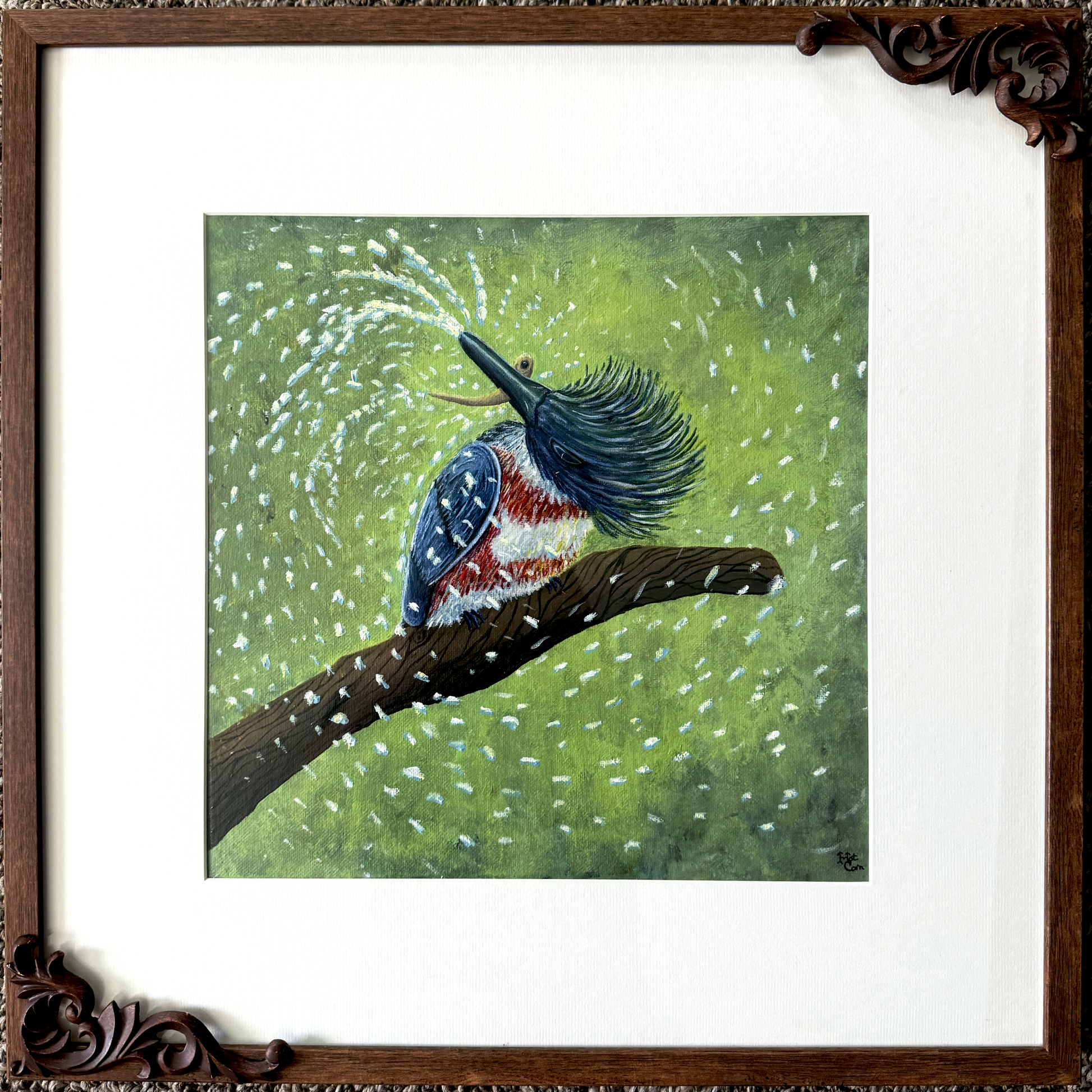 Female Belted Kingfisher on a perch, thrashing water off of a fish she just plucked out of the pond.