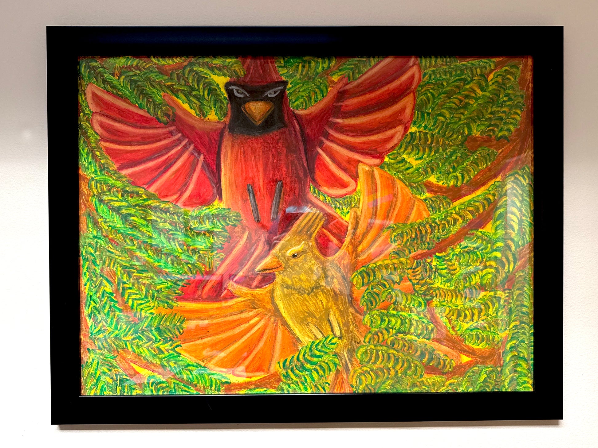 Northern Cardinal (Cardinalis cardinalis) couple emerging from the branches of some coniferous trees