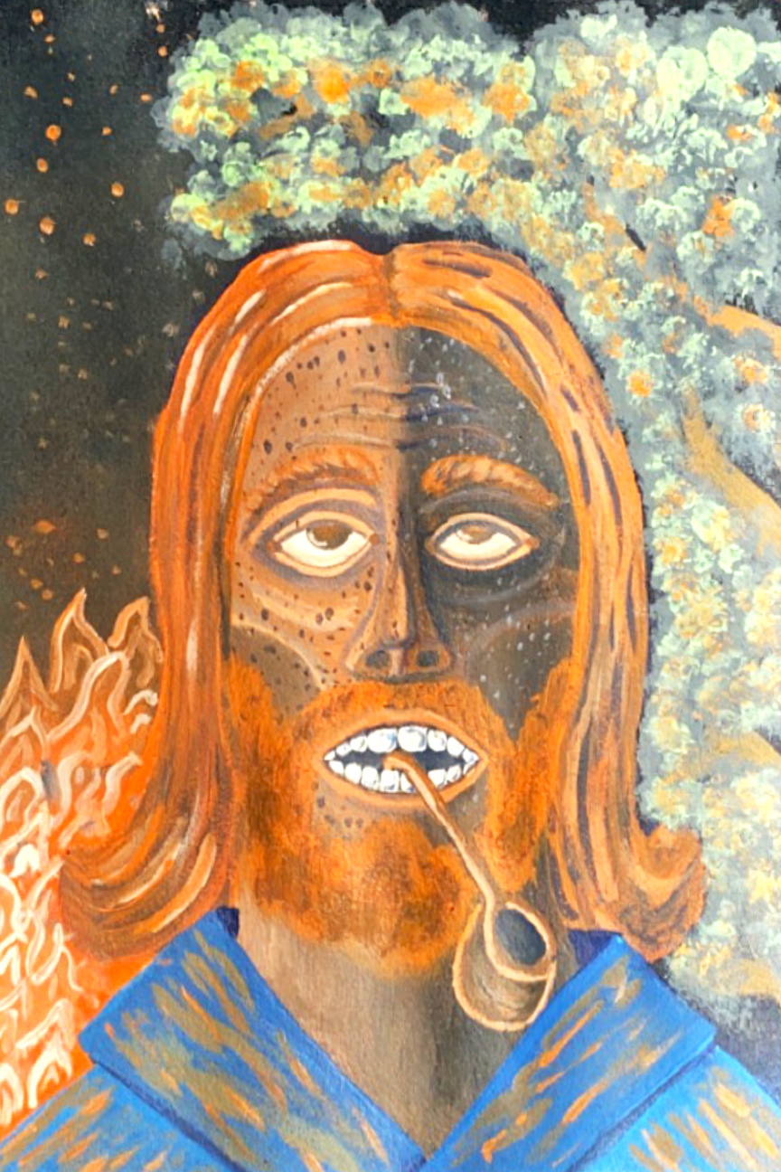 portrait of a long-haired, bearded ginger man smoking a wooden pipe being engulfed in flames